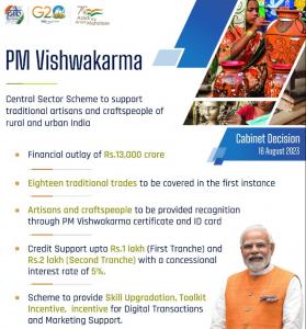 - On 16th of August 2023, the Union Cabinet gave its nod to implement PM Vishwakarma Yojana.