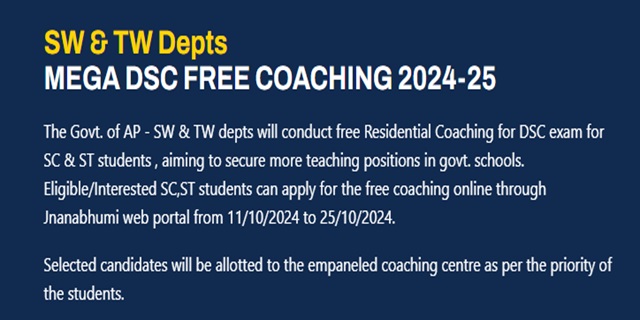 - The announced scheme is also known by other names such as 'AP MEGA DSC Free Coaching Scheme', or 'MEGA DSC Free Coaching Yojana', or 'MEGA DSC Free Coaching Pathakam'.