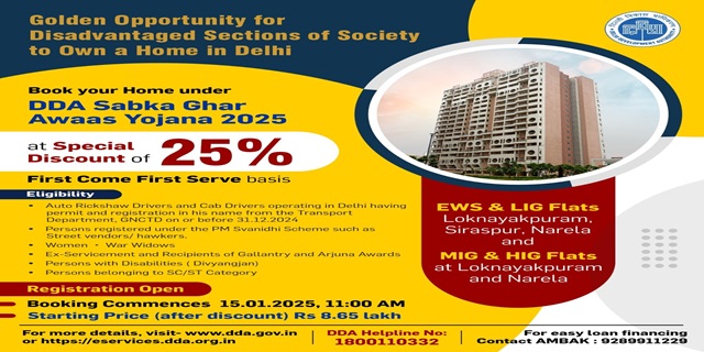 - Flat booking under the DDA Sabka Ghar Awas Yojana will commence on January 15, 2025 11:00 AM onwards.