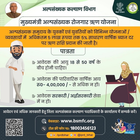 - बिहार, अल्पसंख्यक कल्याण विभाग द्वारा बिहार मुख्यमंत्री अल्पसंख्यक रोजगार ऋण योजना का संचालन किया जाएगा।