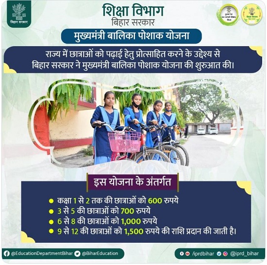 - बिहार सरकार द्वारा वर्ष 2018 में मुख्यमंत्री बालिका पोशाक योजना की शुरुआत की गयी थी।