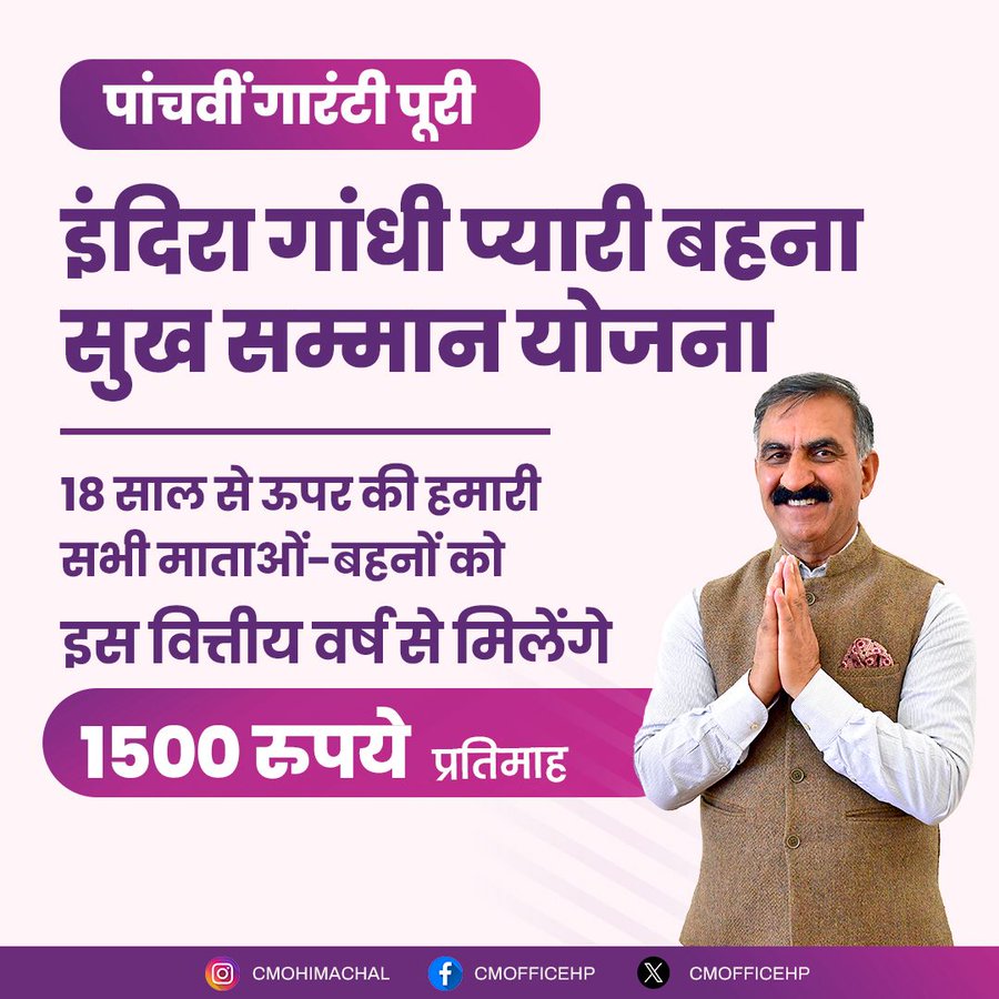 - हिमाचल प्रदेश इंदिरा गांधी प्यारी बहना सुख-सम्मान निधि योजना में राज्य की सभी पात्र महिलाओ को प्रति माह की दर से 1,500/- रूपए प्रदान किये जाएंगे।