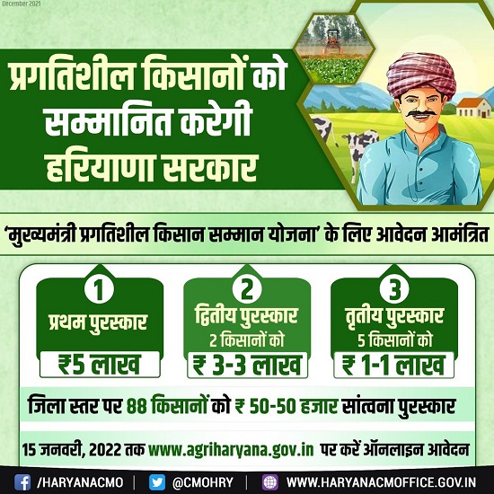 - हरियाणा मुख्यमंत्री प्रगतिशील किसान सम्मान योजना का मकसद प्रगतिशील किसानों को प्रोत्साहन देना है।