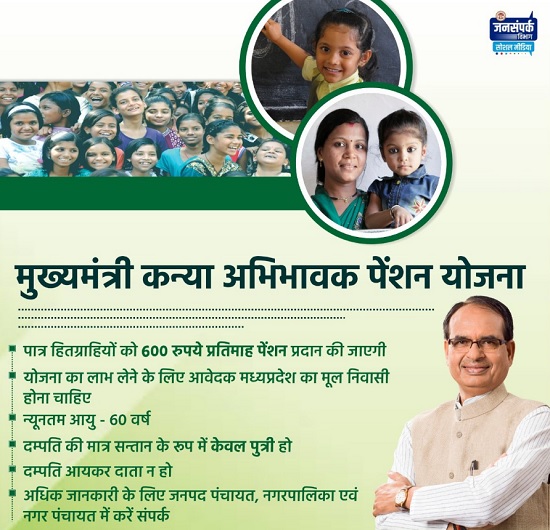 - मुख्यमंत्री कन्या अभिभावक पेंशन योजना के तहत मध्य प्रदेश सरकार पात्र अभिभावकों को प्रति माह पेंशन के रूप में आर्थिक सहायता प्रदान करेगी।