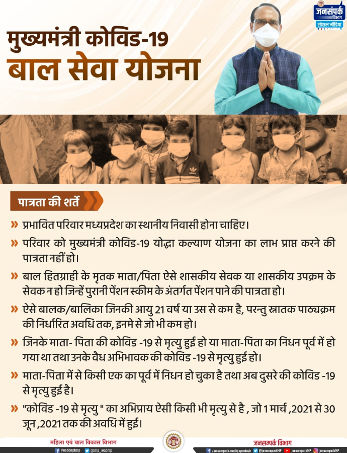 | लाभार्थी | मध्य प्रदेश के अनाथ बच्चे जिनके माता/ पिता की मृत्यु कोविड 19 के कारण हुई हो । |