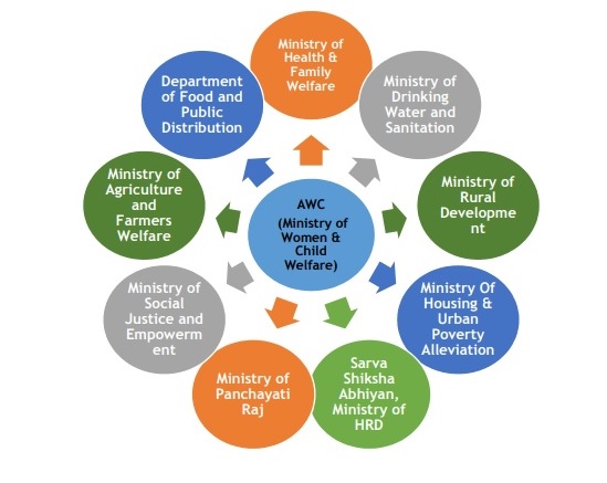 The last 3 services are related to health and are offered by Ministry/Department of Health and Family Welfare through NRHM & Health system. For better governance in the delivery of the Scheme, convergence is, therefore, one of the key features of the ICDS Scheme. This convergence is in-built in the Scheme which provides a platform in the form of Anganwadi Centres for providing all services under the Scheme.