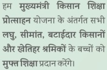 | लाभ | किसान एवं खेतिहर श्रमिकों के बच्चो को मुफ्त शिक्षा प्रदान की जाएगी। |