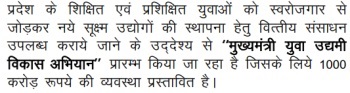 - मुख्यमंत्री जी ने कहा है की प्रदेश में जल्दी ही "मुख्यमंत्री युवा उद्यमी विकास अभियान" योजना की शुरुआत की जाएगी।