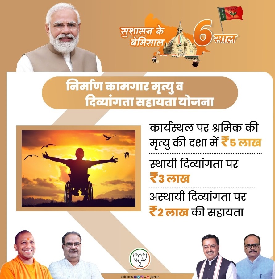 - उत्तर प्रदेश निर्माण कामगार मृत्यु व दिव्यांगता सहायता योजना की शुरुवात उत्तर प्रदेश सरकार द्वारा की गई है।