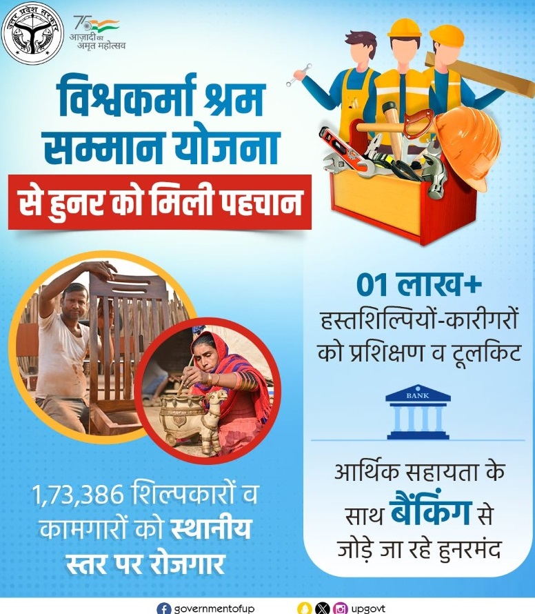 - उत्तर प्रदेश विश्वकर्मा श्रम सम्मान योजना उत्तरप्रदेश के उद्योग एवं उघम प्रोत्साहन निदेशालय द्वारा संचालित की जा रही है।