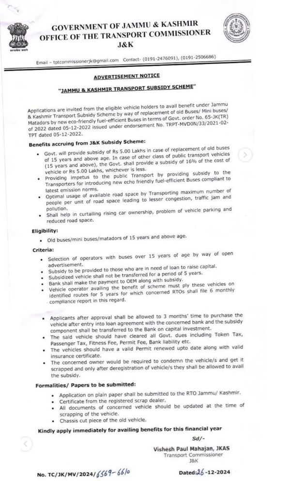 - Jammu and Kashmir Transport Subsidy Scheme Advertisement Notice.