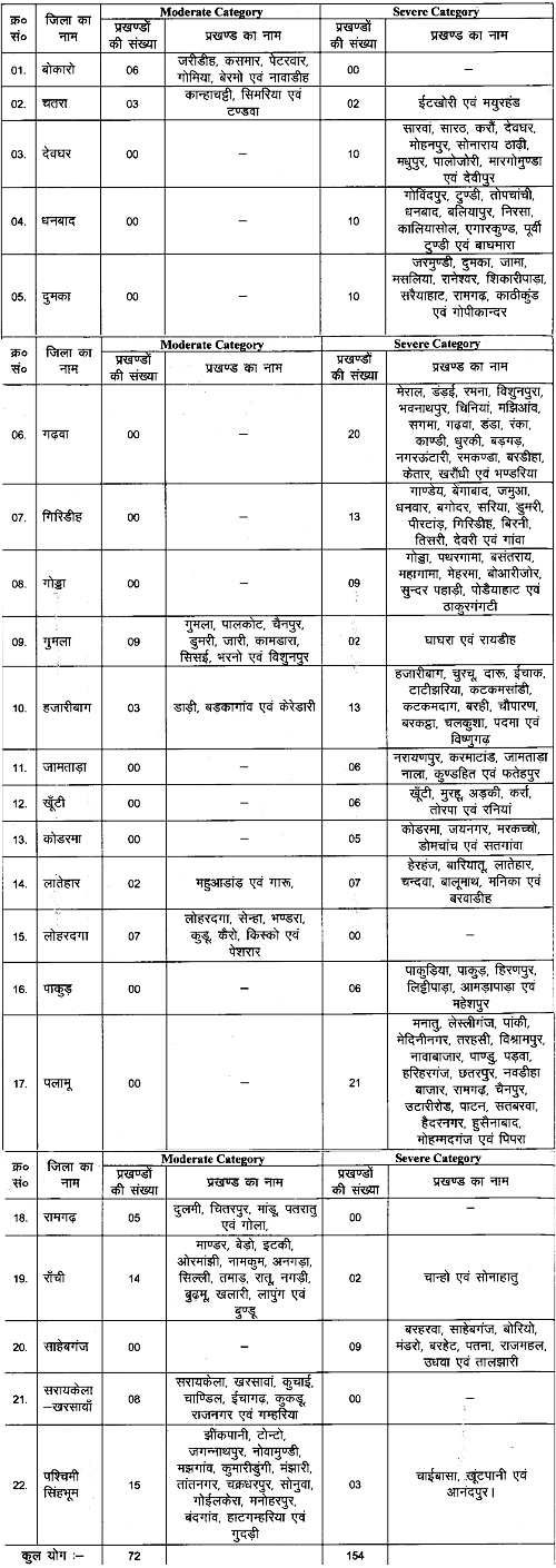 - कुल 226 प्रखण्डों में से 154 प्रखण्डों को severe तथा 72 प्रखण्डों को moderate की श्रेणी में चिन्हित किया गया है।