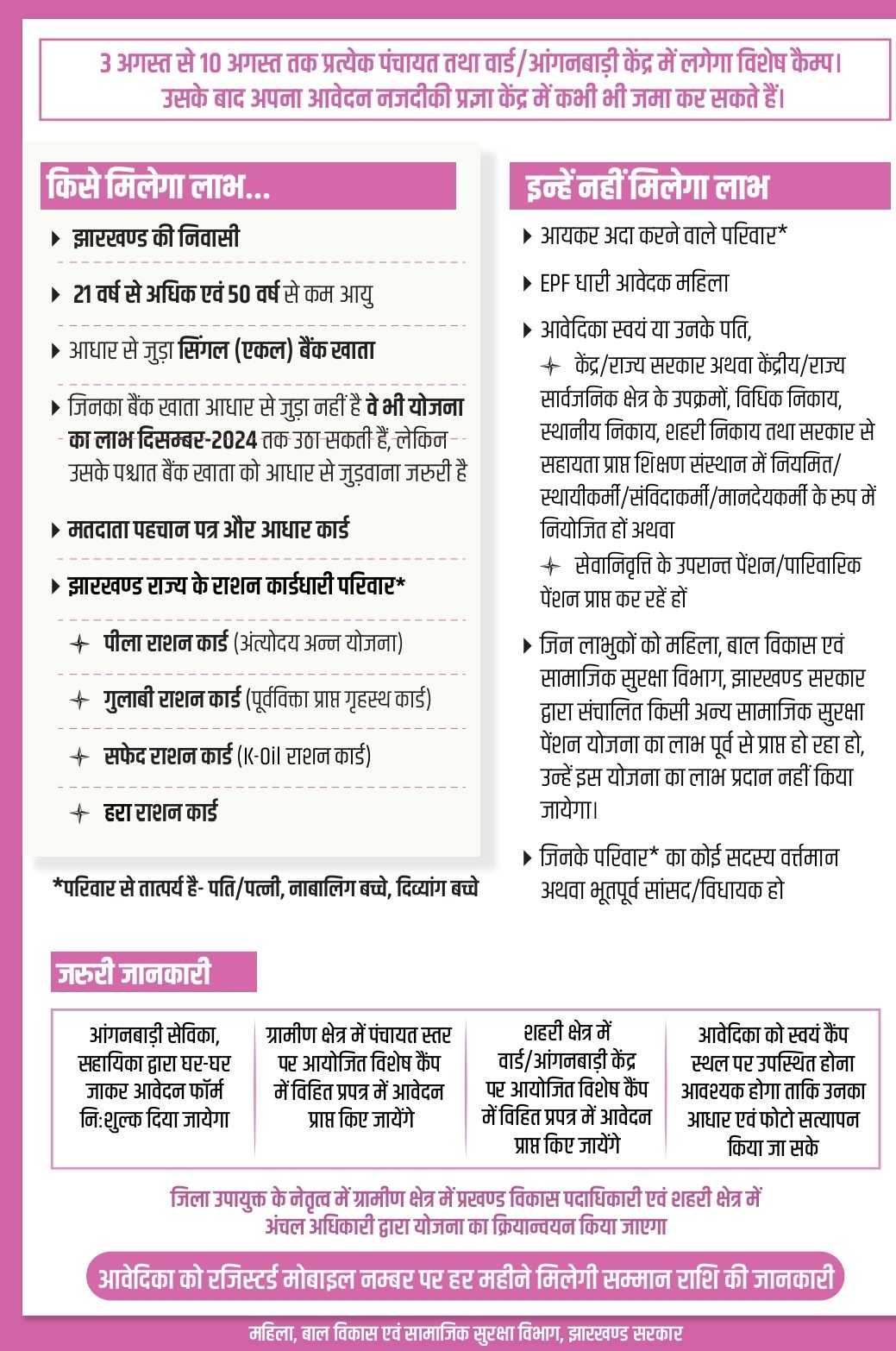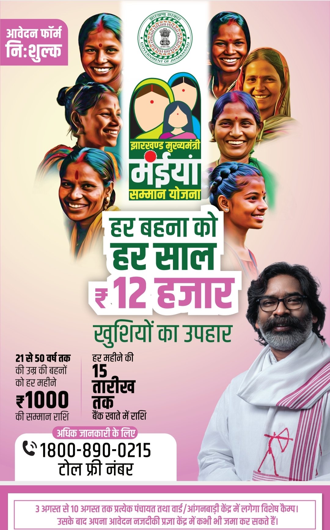 - Moreover, the scheme is also known by other names including, 'Jharkhand Chief Minister Maiyya Samman Yojana', or 'Jharkhand Mukhyamantri Maiyya Samman Scheme', and 'Jharkhand Mai-Kui Swavalamban Protsahan Yojana'.