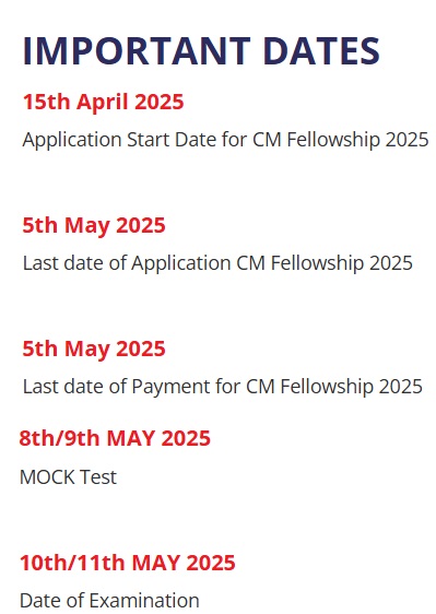 - Application for Chief Minister Fellowship Program for the year 2025-2026 is started from 15th of April 2025 and the last date to apply is 5th of May 2025.