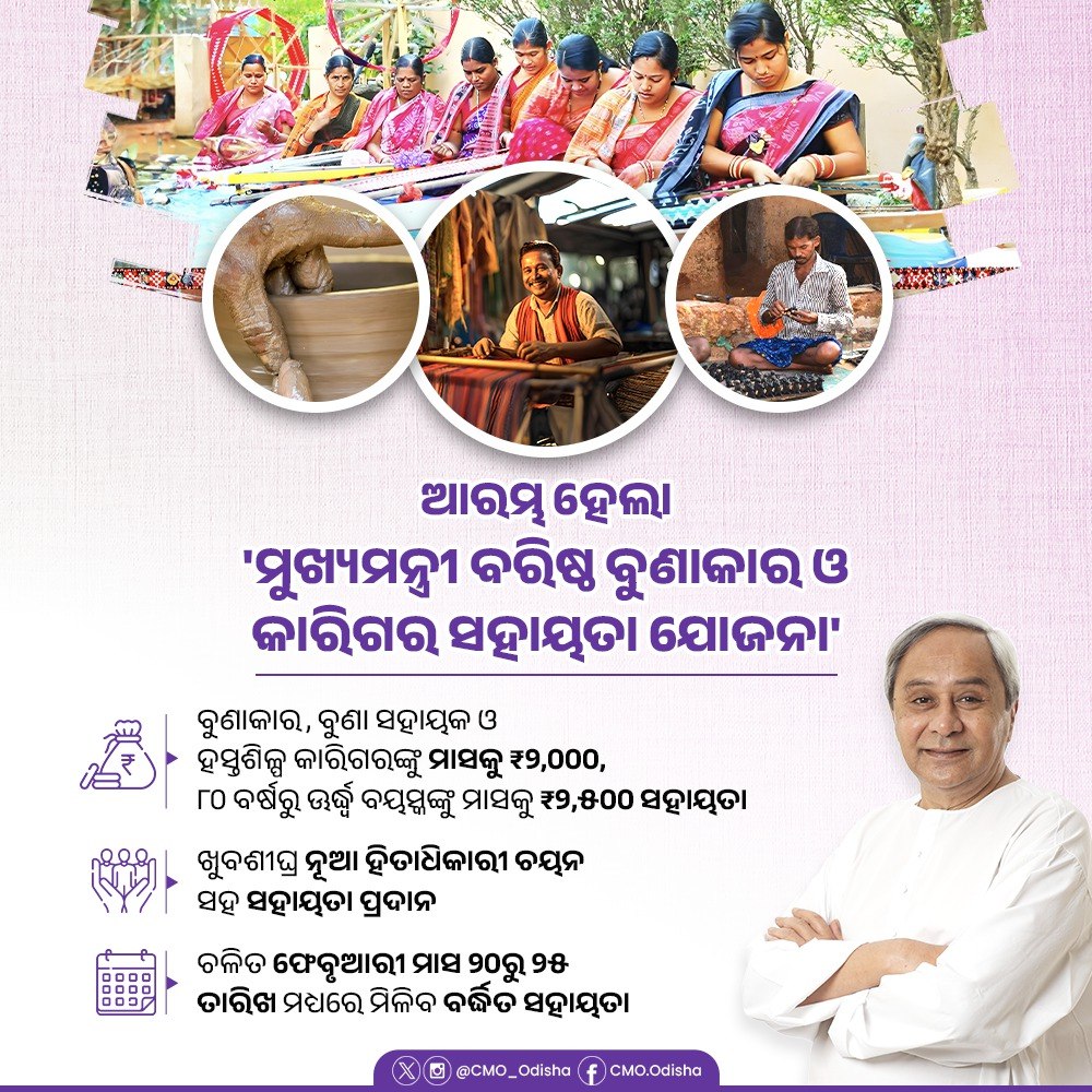 - The Odisha State Government, led by BJD's Naveen Patnayak, has announced a new scheme known as the 'Mukhyamantri Baristha Bunakar & Karigara Sahayata Yojana'.