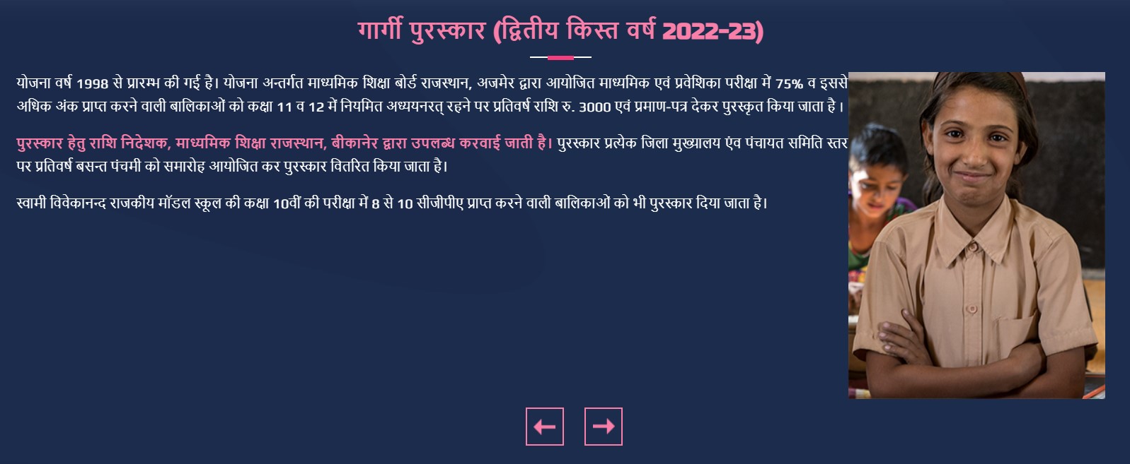 - Online Applications for Gargi Puraskar Yojana can be submitted through Rajasthan Secondary Education Department Portal.