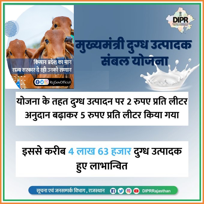 - Eligible farmers can receive benefits provided under the Rajasthan Mukhyamantri Dugdh Utpadak Sambal Yojana.