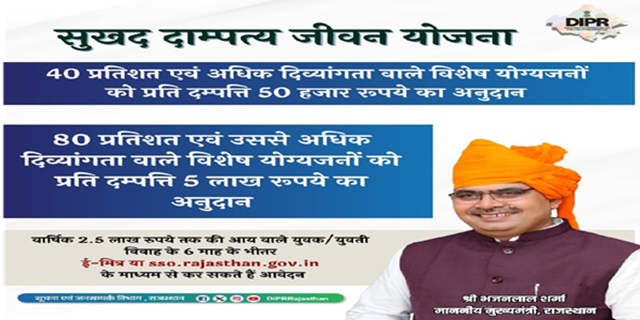 • Under the Rajasthan Sukhad Dampatya Jeevan Yojana a certain grant is provided to these disabled couples, with an amount depending on their disability percentage.