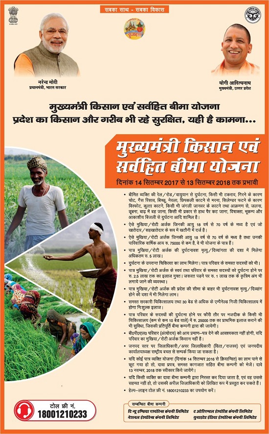 - मुख्यमंत्री किसान एवं सर्वहित बीमा योजना को उत्तर प्रदेश के मुख्यमंत्री योगी आदित्यनाथ जी के द्वारा 14/09/2018 को आरंभ किया गया है।