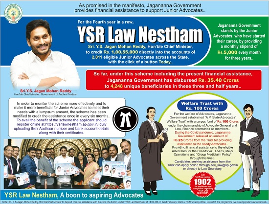 - Keeping these things in mind, Government of Andhra Pradesh started YSR Law Nestham Scheme for Junior Advocates of Andhra Pradesh.